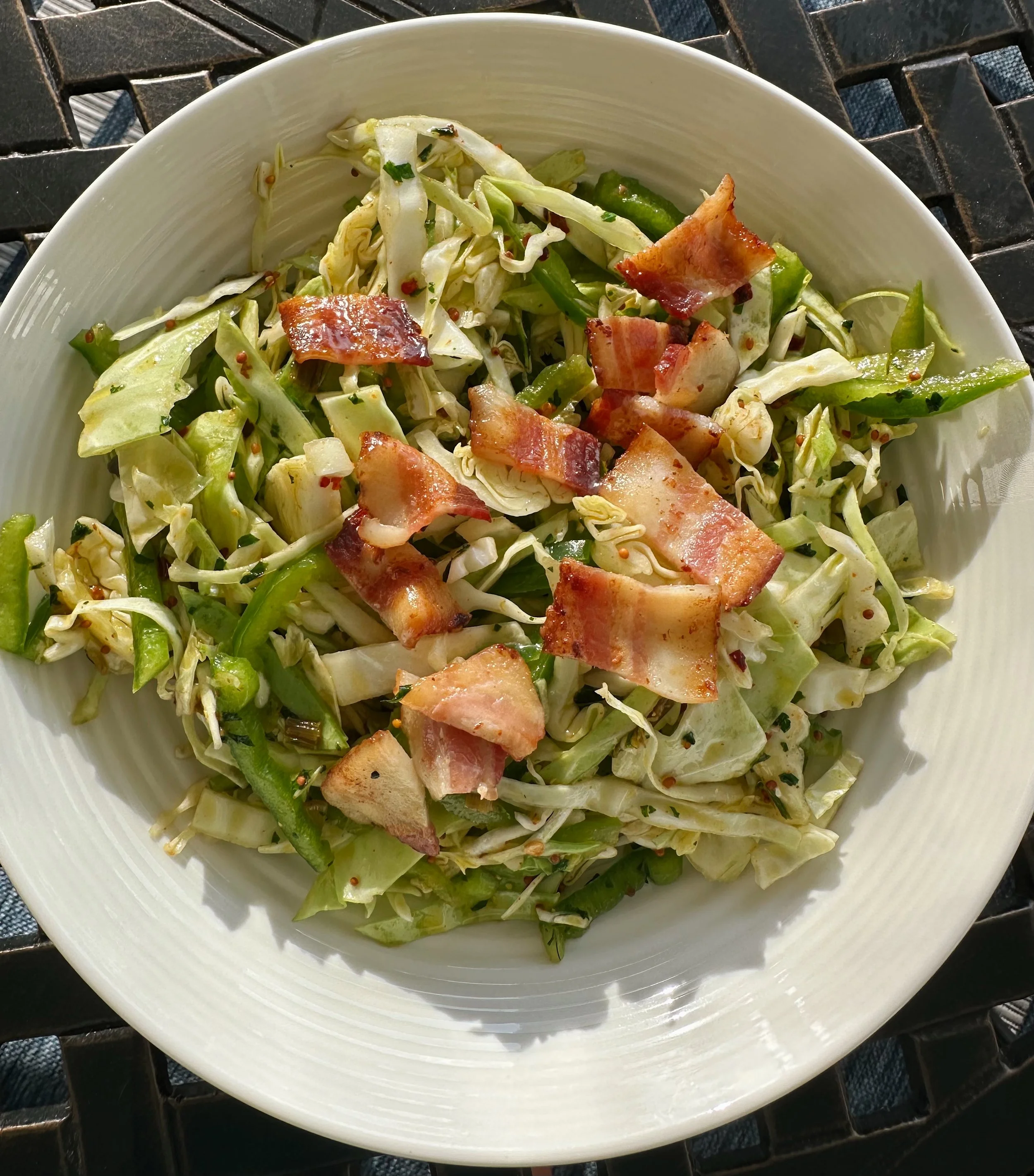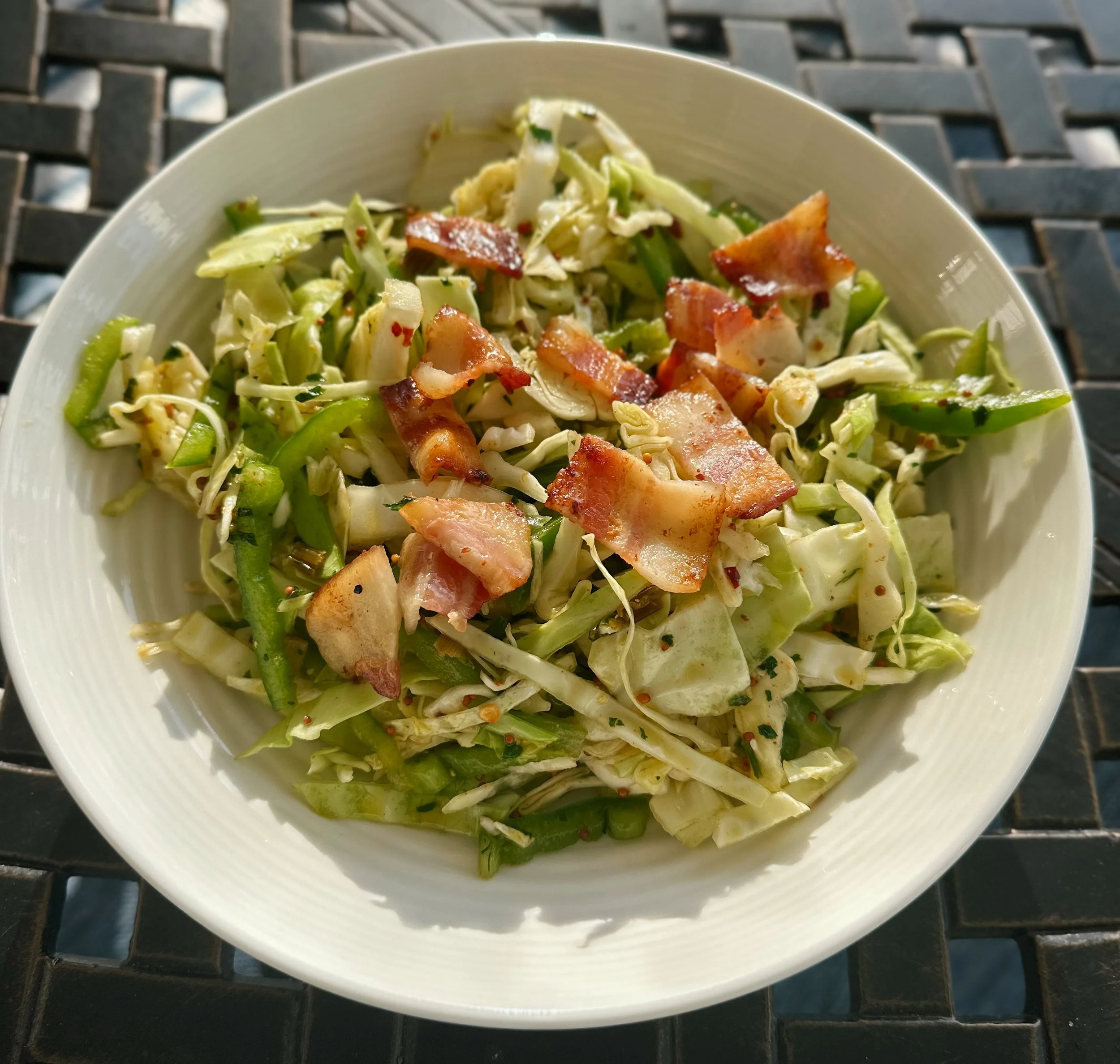 Place the cabbage in a large mixing bowl and stir in the bell peppers and red pepper flakes.